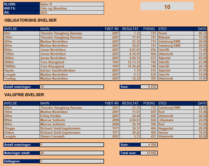 Vi fikk 12842 poeng i 3. divisjon for menn og ble nr. 10. Dette er vår beste poengsum noensinne (statistikken på friidrett.no går tilbake til 2003) og klar fremgang fra i fjor da vi oppnådde 11331 poeng og ble nr. 25.