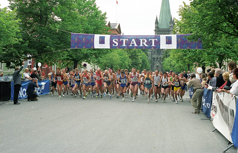 Ett hundre og femti lag løper samtidig ut fra Domkirken i Trondheim. Det er et syn å skue, men det er ingenting i mot hva det blir når selve løpet er i gang for alvor, med all den dramatikk og intensitet som oppstår under et slikt arrangement. Bølers karakteristiske blågule drakt er representert ved Thomas Eidsmo ganske langt til venstre i bildet.