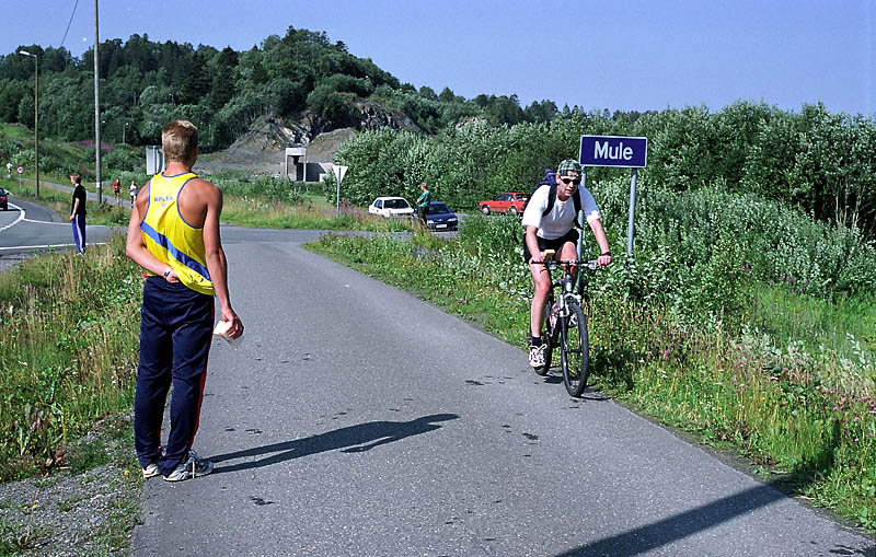 En gjennomgangsfigur i stort sett hele løpet var mannen som jeg her og nå døper "Den uoppslitelige syklist," Trond Hval, som med sin personlige rekord på 1:14 riktignok aldri har klart å straffe sin gamle klassekamerat Per Jorås' tid1:09 på 50 kilometer tempo, syklet ikke desto mindre med stor utholdenhet sammen med løperne og sekunderte. Klikk, og du vil se syklisten. Senere ble den samme syklist observert ved Mule. På engelsk betyr jo "mule" "muldyr," så det er vel ikke helt upresist da disse er kjent for å holde ut gjennom store påkjenninger. I overført betydning kan "mule" også bety "svært sta person," og en slik egenskap må man kanskje ha for å holde på med all den syklingen, spesielt når treningstilstanden kanskje ikke helt er på toppnivå. Men godt gjort var det i alle fall, og hvor mye våre løpere vant på sekunderingen kan vi bare tenke oss til.