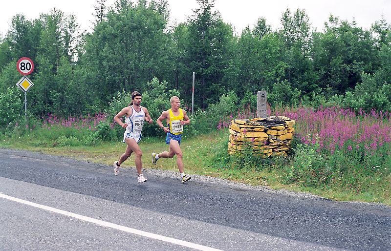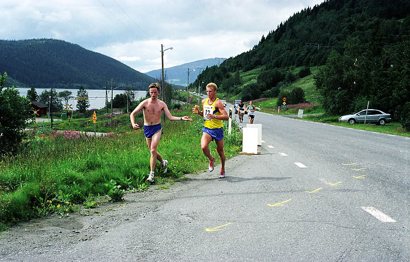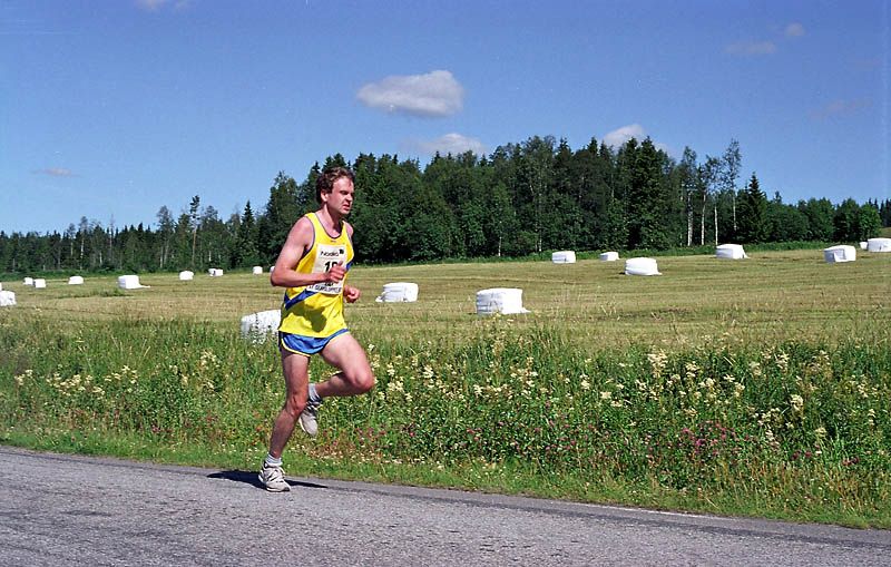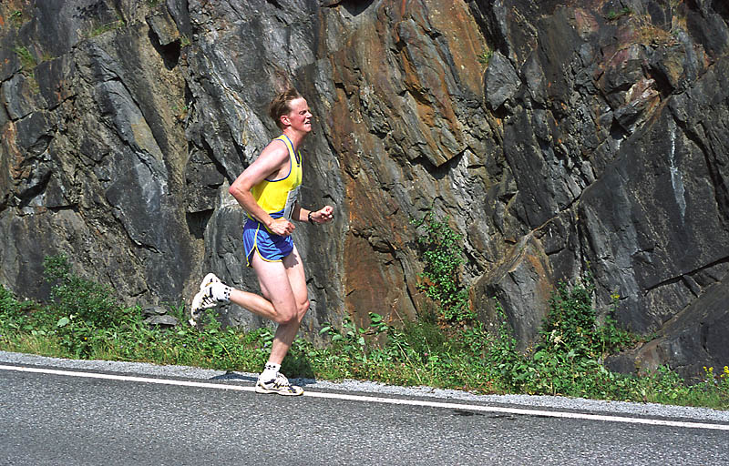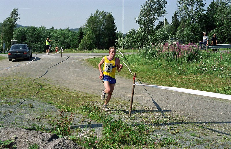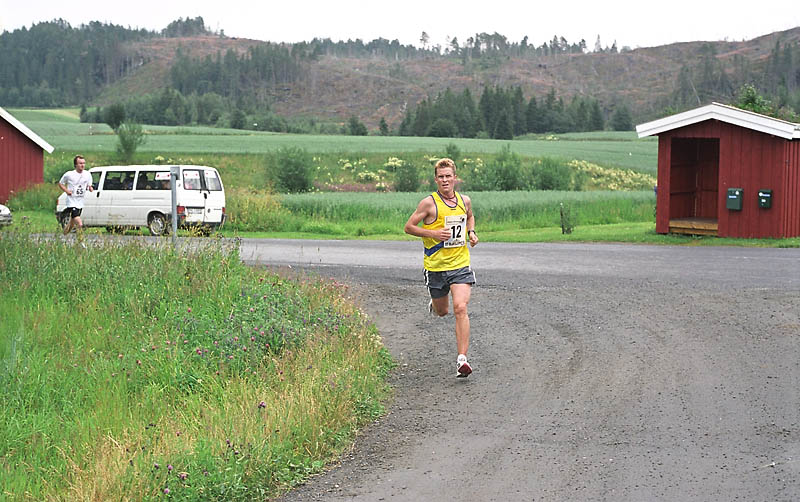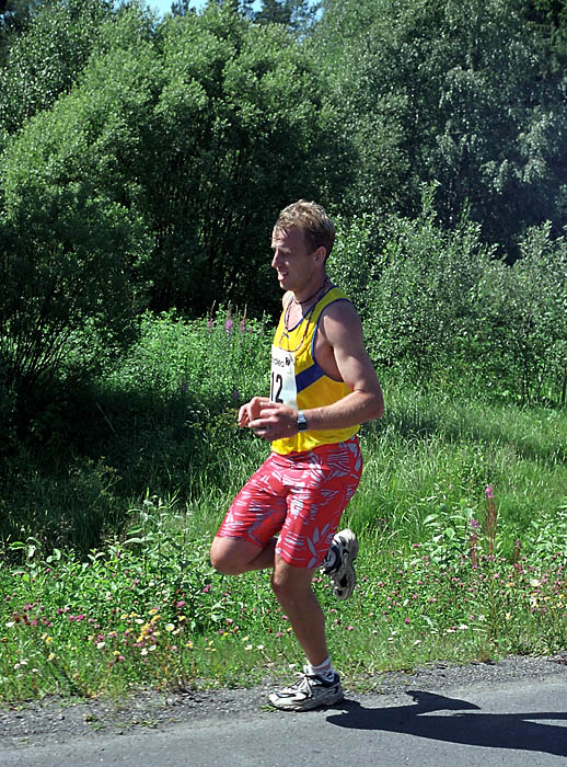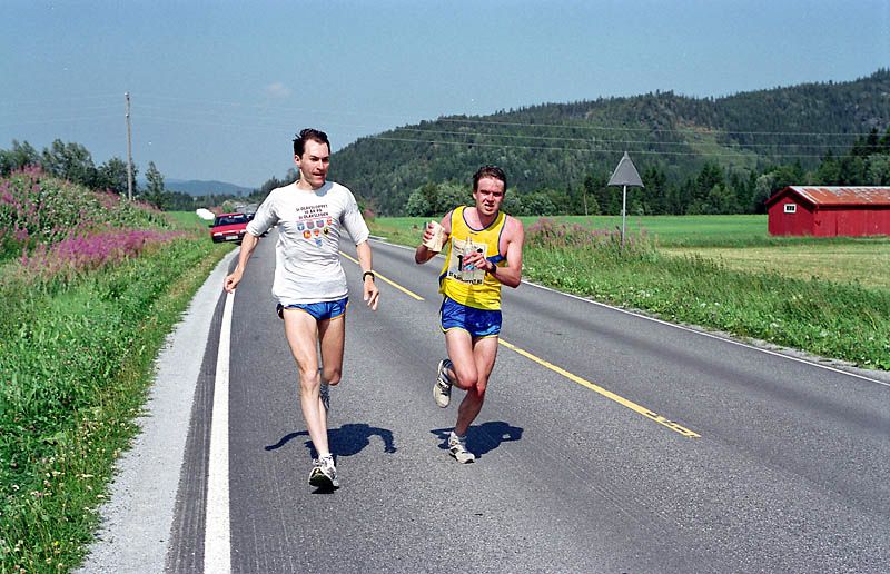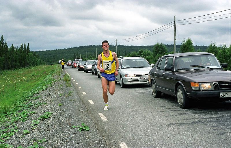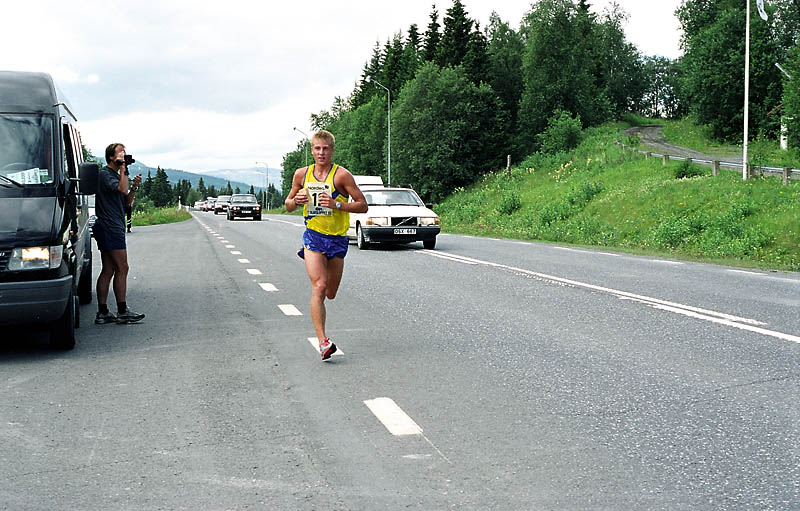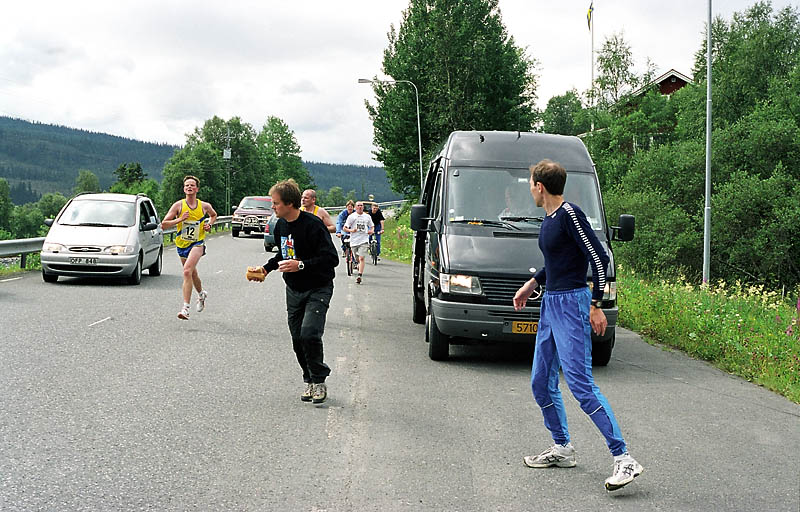 Per Kr. Saastad var vår ankermann inn i Østersund i 2002, og løp en halvmaraton, 21 km, i stekende hete. Det var ikke fritt for at dette gikk en anelse tungt. Dette er et faktum og naturligvis ikke en kritikk av Per, som vi ser her: Per Kristian 1, Per Kristian 2, Per Kristian 3, Per Kristian 4.