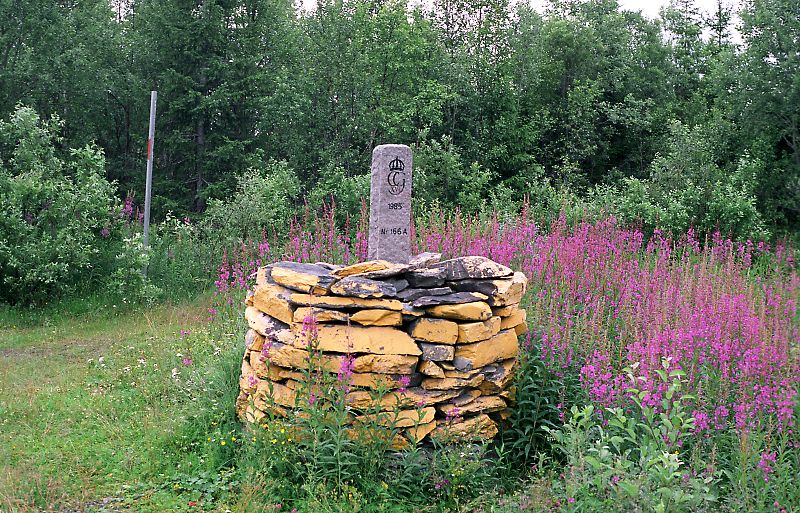 Det finske og svenske landslagets løpere deltok også med nasjonslag: Side om side ved grenserøysen. Nærbilde av sistnevnte gulmalte stenhaug ser du her.
