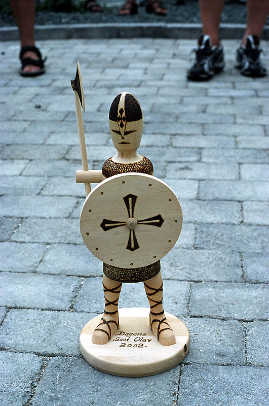 Flere enn Bølers deltakere mente at innsatsen var prisverdig, så i Sandvika hadde arrangøren en overraskelse til oss: En St. Olav-statuett i løvtre, med skjold, stridsøks og det hele. Den historisk interesserte kunne riktignok føle noen små anfektelser ved tanken på at Bøler fikk et slikt symbol til eie, for det er jo liten tvil om at den navngjetne helgenkongen var en av de grusomste, mest brutale og voldelige menn som noengang har hersket i Norge, og atskillige nordmenn og -kvinner ble i sin tid utsatt for både tukt, tortur og mord under Olavs tvangskristninger, der kongen med stor patos erklærte at hver den som ikke tok i mot Kvitekrist skulle miste både gard og grunn og endatil livet hvis de kunne få tak i den fryktelige hedningen. Men helt så gravalvorlig skal man jo ikke ta tildragelser som skjedde for meget lenge siden, og alle i Bøler-flokken var glade for utmerkelsen, selv om den ukjente kunstneren hadde lagt inn en skrivefeil med svipenn på statuettens fot. Her ser vi den i alle fall: "Dagens St. Olav 2002."